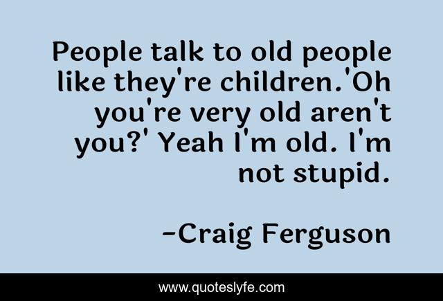 This page presents the quote "People talk to old people like they're children.'Oh you're very old aren't you?' Yeah I'm old. I'm not stupid.". Author of this quote is Craig Ferguson. This quote is about condescension, age, wisdom,.