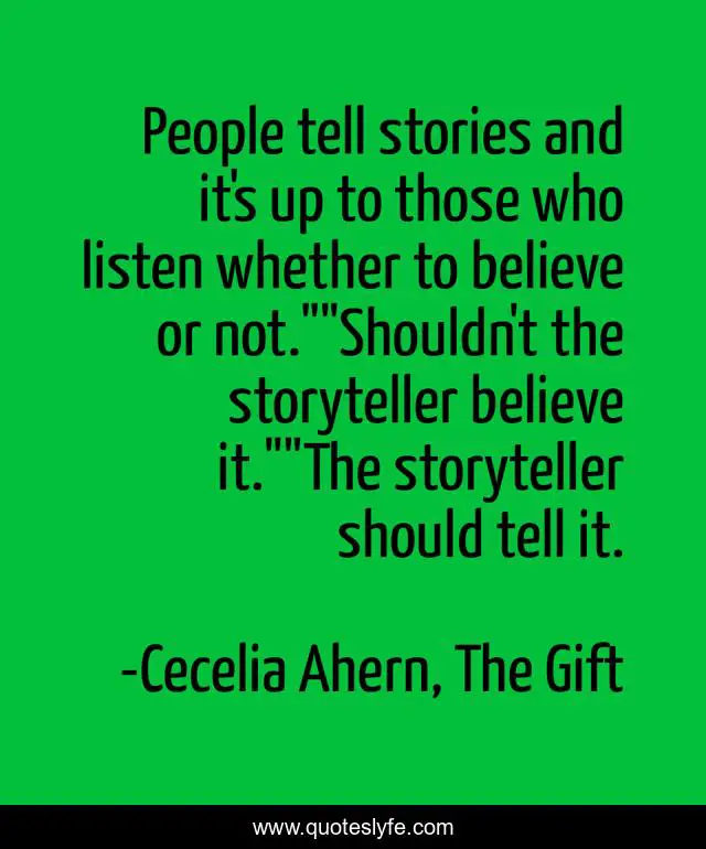 This page presents the quote "People tell stories and it's up to those who listen whether to believe or not.""Shouldn't the storyteller believe it.""The storyteller should tell it.". Author of this quote is Cecelia Ahern, The Gift. This quote is about story, storytelling,.