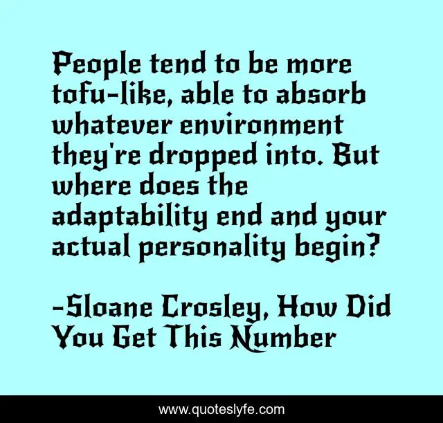 This page presents the quote "People tend to be more tofu-like, able to absorb whatever environment they're dropped into. But where does the adaptability end and your actual personality begin?". Author of this quote is Sloane Crosley, How Did You Get This Number. This quote is about adaptability, personality,.