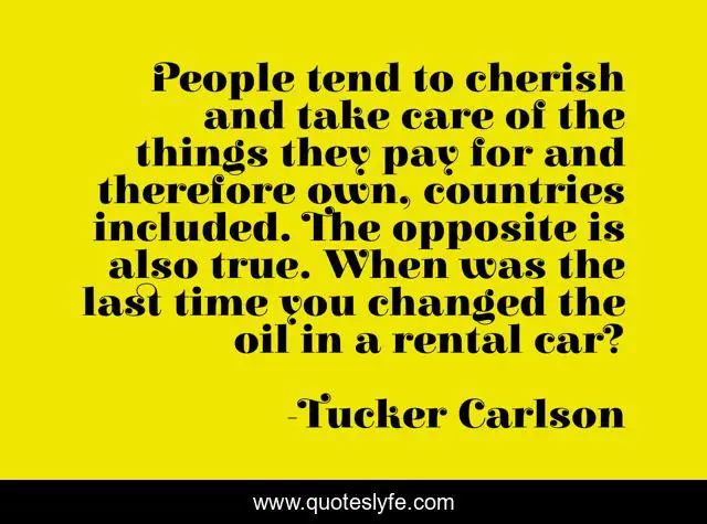 This page presents the quote "People tend to cherish and take care of the things they pay for and therefore own, countries included. The opposite is also true. When was the last time you changed the oil in a rental car?". Author of this quote is Tucker Carlson. This quote is about care, time, people,.