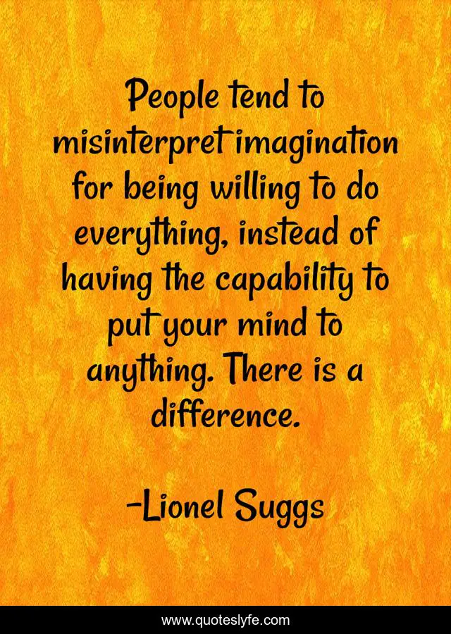 This page presents the quote "People tend to misinterpret imagination for being willing to do everything, instead of having the capability to put your mind to anything. There is a difference.". Author of this quote is Lionel Suggs. .