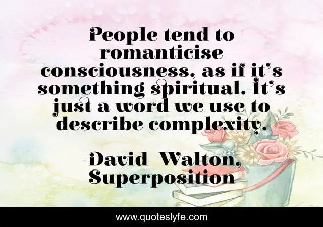 This page presents the quote "People tend to romanticise consciousness, as if it’s something spiritual. It’s just a word we use to describe complexity.". Author of this quote is David Walton, Superposition. .