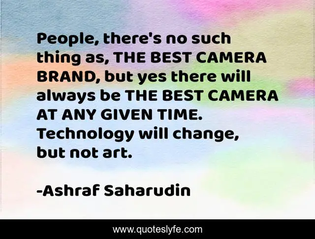 This page presents the quote "People, there's no such thing as, THE BEST CAMERA BRAND, but yes there will always be THE BEST CAMERA AT ANY GIVEN TIME. Technology will change, but not art.". Author of this quote is Ashraf Saharudin. This quote is about art, branding, brand, cameras, camera, time, technology, photography,.