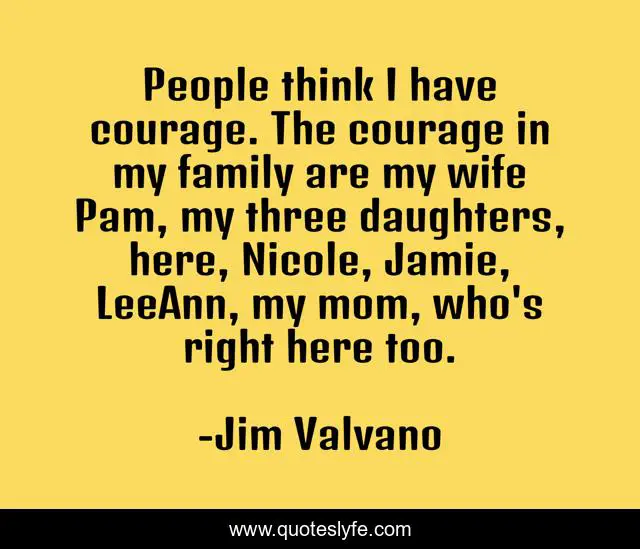 This page presents the quote "People think I have courage. The courage in my family are my wife Pam, my three daughters, here, Nicole, Jamie, LeeAnn, my mom, who's right here too.". Author of this quote is Jim Valvano. This quote is about family, mom, wife,.