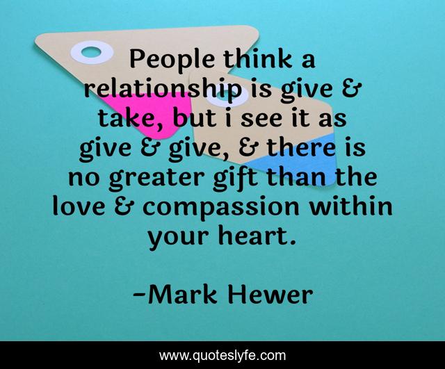 This page presents the quote "People think a relationship is give & take, but i see it as give & give, & there is no greater gift than the love & compassion within your heart.". Author of this quote is Mark Hewer. This quote is about heart, love, gift, compassion, give-take, affection,.