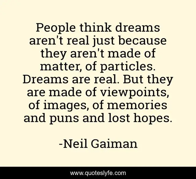"Neil Gaiman Quotes." Quoteslyfe.com, 2025. Wed. 10 Dec. 2025. <https://www.quoteslyfe.com/quote/People-think-dreams-aren-t-real-just-53075>.