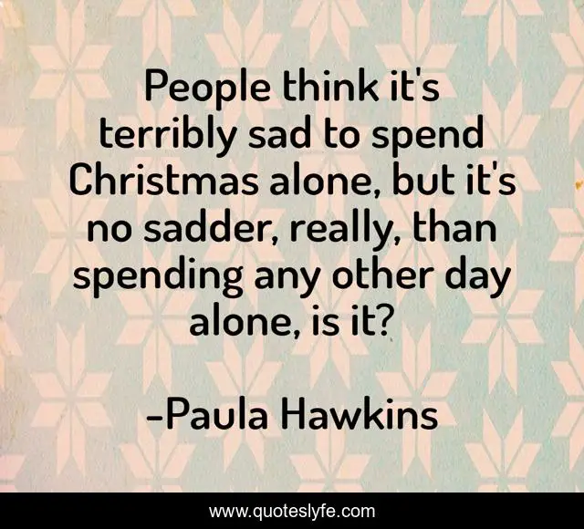 This page presents the quote "People think it's terribly sad to spend Christmas alone, but it's no sadder, really, than spending any other day alone, is it?". Author of this quote is Paula Hawkins. This quote is about alone, day, sad,.