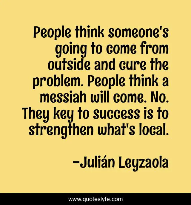 This page presents the quote "People think someone's going to come from outside and cure the problem. People think a messiah will come. No. They key to success is to strengthen what's local.". Author of this quote is Julián Leyzaola. This quote is about politics, police, crime,.