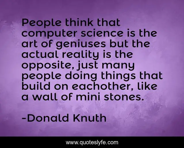 This page presents the quote "People think that computer science is the art of geniuses but the actual reality is the opposite, just many people doing things that build on eachother, like a wall of mini stones.". Author of this quote is Donald Knuth. This quote is about reality, art, people,.