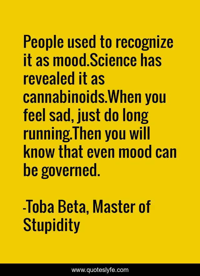 This page presents the quote "People used to recognize it as mood.Science has revealed it as cannabinoids.When you feel sad, just do long running.Then you will know that even mood can be governed.". Author of this quote is Toba Beta, Master of Stupidity. This quote is about chemistry, run, mood, sad, brain, running, cannabinoids, sport, happiness,.