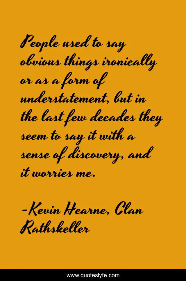 This page presents the quote "People used to say obvious things ironically or as a form of understatement, but in the last few decades they seem to say it with a sense of discovery, and it worries me.". Author of this quote is Kevin Hearne, Clan Rathskeller. .