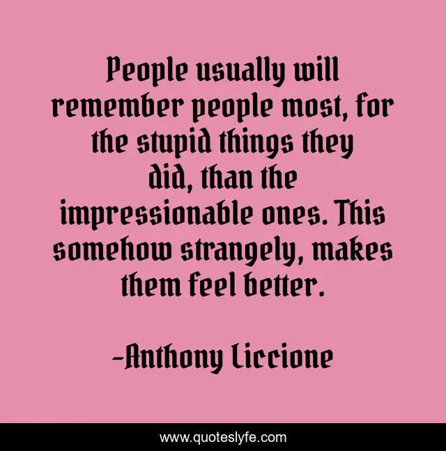 This page presents the quote "People usually will remember people most, for the stupid things they did, than the impressionable ones. This somehow strangely, makes them feel better.". Author of this quote is Anthony Liccione. This quote is about fool, strangely, egotist, bully, idiot, name-calling, gossip, make-fun-of, stupidity,.