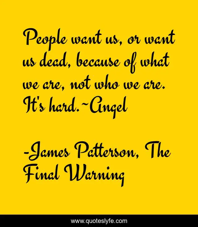 This page presents the quote "People want us, or want us dead, because of what we are, not who we are. It's hard.~Angel". Author of this quote is James Patterson, The Final Warning. This quote is about life, reality, patterson, angel, james, ride, lessons-of-life, maximum, james-patterson,.