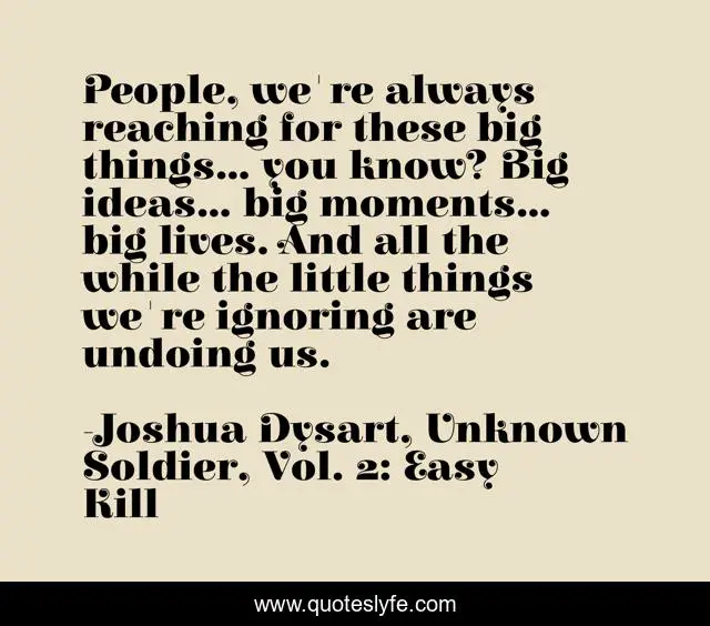 This page presents the quote "People, we're always reaching for these big things... you know? Big ideas... big moments... big lives. And all the while the little things we're ignoring are undoing us.". Author of this quote is Joshua Dysart, Unknown Soldier, Vol. 2: Easy Kill. This quote is about big-dreams, life-philosophy, ignorance, goals-in-life, little-things,.