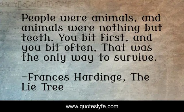 This page presents the quote "People were animals, and animals were nothing but teeth. You bit first, and you bit often, That was the only way to survive.". Author of this quote is Frances Hardinge, The Lie Tree. This quote is about animal, survival, the-lie-tree, frances-hardinge, human, biting,.