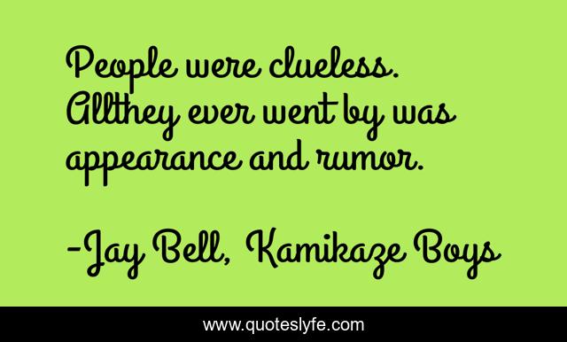 This page presents the quote "People were clueless. Allthey ever went by was appearance and rumor.". Author of this quote is Jay Bell, Kamikaze Boys. This quote is about prejudice, apperances, stereotypes,.