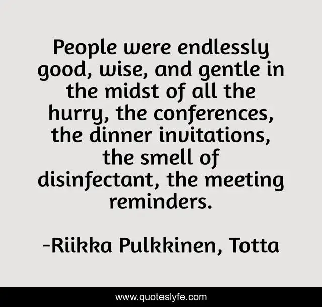 This page presents the quote "People were endlessly good, wise, and gentle in the midst of all the hurry, the conferences, the dinner invitations, the smell of disinfectant, the meeting reminders.". Author of this quote is Riikka Pulkkinen, Totta. .