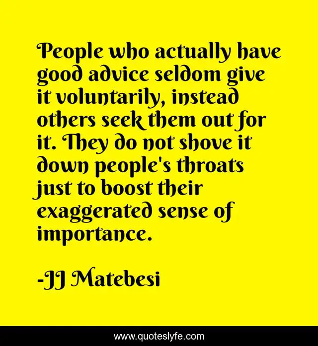 This page presents the quote "People who actually have good advice seldom give it voluntarily, instead others seek them out for it. They do not shove it down people's throats just to boost their exaggerated sense of importance.". Author of this quote is JJ Matebesi. .