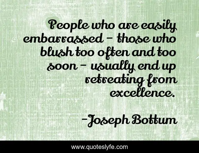 This page presents the quote "People who are easily embarrassed – those who blush too often and too soon – usually end up retreating from excellence.". Author of this quote is Joseph Bottum. This quote is about pride, humility,.