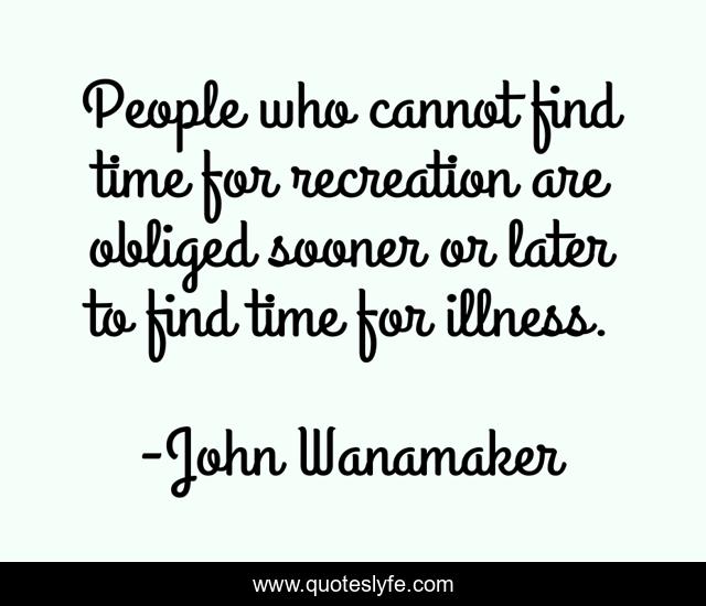 This page presents the quote "People who cannot find time for recreation are obliged sooner or later to find time for illness.". Author of this quote is John Wanamaker. This quote is about illness, find, people,.