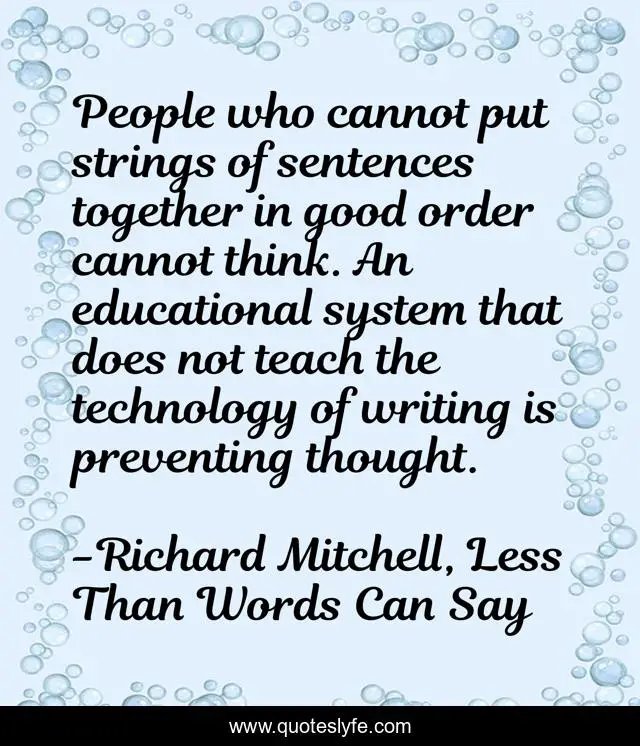 This page presents the quote "People who cannot put strings of sentences together in good order cannot think. An educational system that does not teach the technology of writing is preventing thought.". Author of this quote is Richard Mitchell, Less Than Words Can Say. This quote is about education-system, thought, logic,.