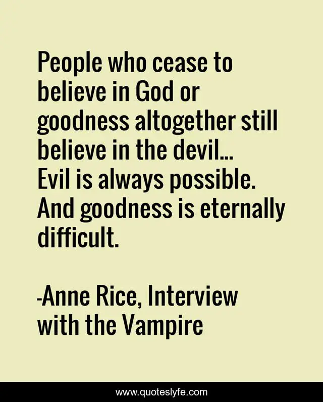This page presents the quote "People who cease to believe in God or goodness altogether still believe in the devil... Evil is always possible. And goodness is eternally difficult.". Author of this quote is Anne Rice, Interview with the Vampire. This quote is about good, god, bad, devil, religion,.