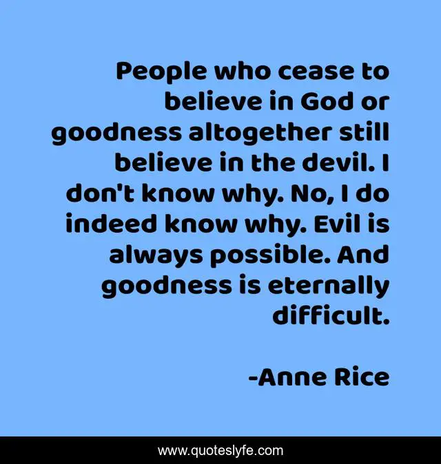This page presents the quote "People who cease to believe in God or goodness altogether still believe in the devil. I don't know why. No, I do indeed know why. Evil is always possible. And goodness is eternally difficult.". Author of this quote is Anne Rice. This quote is about believe, evil, people,.