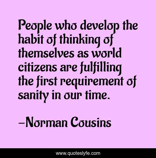 This page presents the quote "People who develop the habit of thinking of themselves as world citizens are fulfilling the first requirement of sanity in our time.". Author of this quote is Norman Cousins. This quote is about sanity, earth, life, citizens-of-the-world, world,.