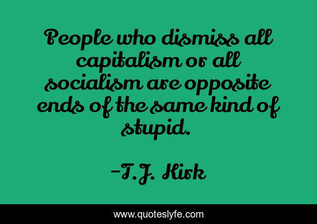 This page presents the quote "People who dismiss all capitalism or all socialism are opposite ends of the same kind of stupid.". Author of this quote is T.J. Kirk. This quote is about socialism, capitalism,.