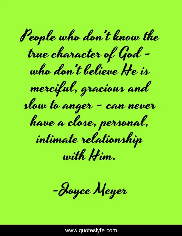 This page presents the quote "People who don't know the true character of God - who don't believe He is merciful, gracious and slow to anger - can never have a close, personal, intimate relationship with Him.". Author of this quote is Joyce Meyer. This quote is about anger, god, character,.