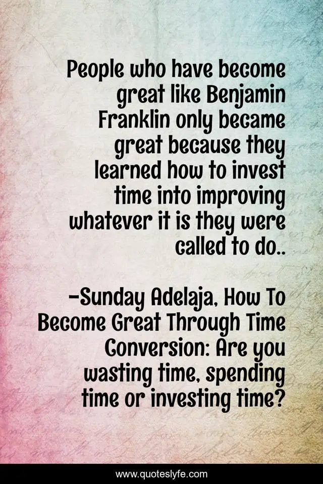 This page presents the quote "People who have become great like Benjamin Franklin only became great because they learned how to invest time into improving whatever it is they were called to do..". Author of this quote is Sunday Adelaja, How To Become Great Through Time Conversion: Are you wasting time, spending time or investing time?. This quote is about people, life, great-people, investment, conversion, productivity, wealth, improvement, time-investment,.