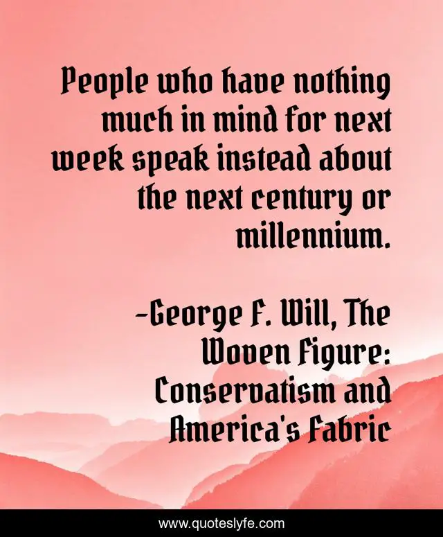 This page presents the quote "People who have nothing much in mind for next week speak instead about the next century or millennium.". Author of this quote is George F. Will, The Woven Figure: Conservatism and America's Fabric. This quote is about vagueness, leadership, focus, strategy,.