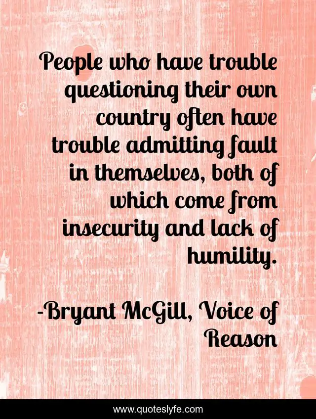 This page presents the quote "People who have trouble questioning their own country often have trouble admitting fault in themselves, both of which come from insecurity and lack of humility.". Author of this quote is Bryant McGill, Voice of Reason. This quote is about discrimination, humility, insecurity,.