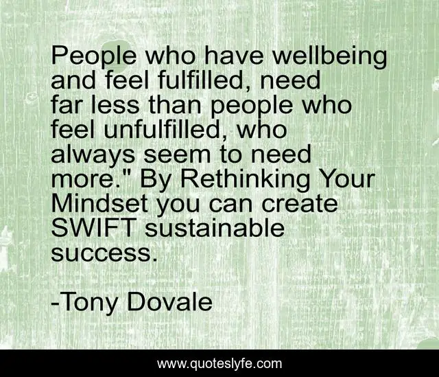 This page presents the quote "People who have wellbeing and feel fulfilled, need far less than people who feel unfulfilled, who always seem to need more." By Rethinking Your Mindset you can create SWIFT sustainable success.". Author of this quote is Tony Dovale. This quote is about success, entrepreneurs, tony-dovale, attitudes, psycap, resilience, happiness, mindset,.
