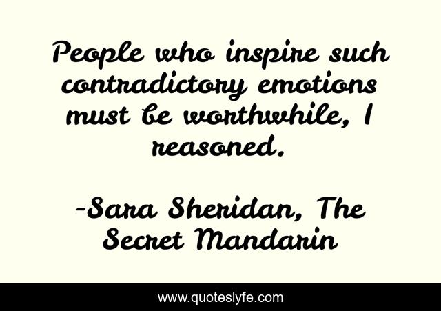 This page presents the quote "People who inspire such contradictory emotions must be worthwhile, I reasoned.". Author of this quote is Sara Sheridan, The Secret Mandarin. This quote is about emotion, contradictory, worth, people,.