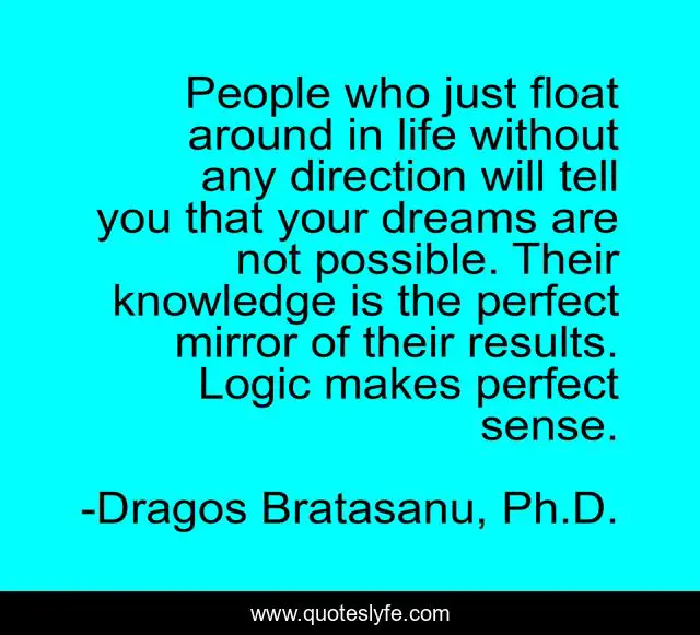 This page presents the quote "People who just float around in life without any direction will tell you that your dreams are not possible. Their knowledge is the perfect mirror of their results. Logic makes perfect sense.". Author of this quote is Dragos Bratasanu, Ph.D.. This quote is about opinions, listen-to-your-heart, knowledge, people, advice, follow-your-dreams,.