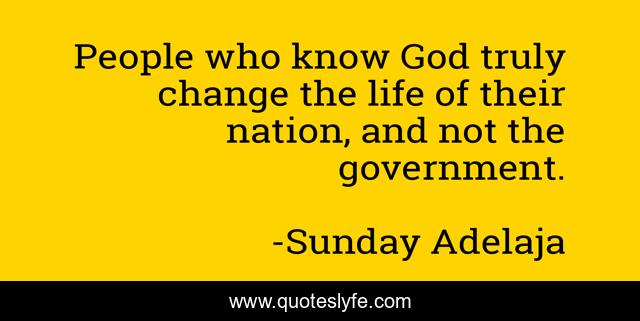 This page presents the quote "People who know God truly change the life of their nation, and not the government.". Author of this quote is Sunday Adelaja. This quote is about government, change, christians, nations,.