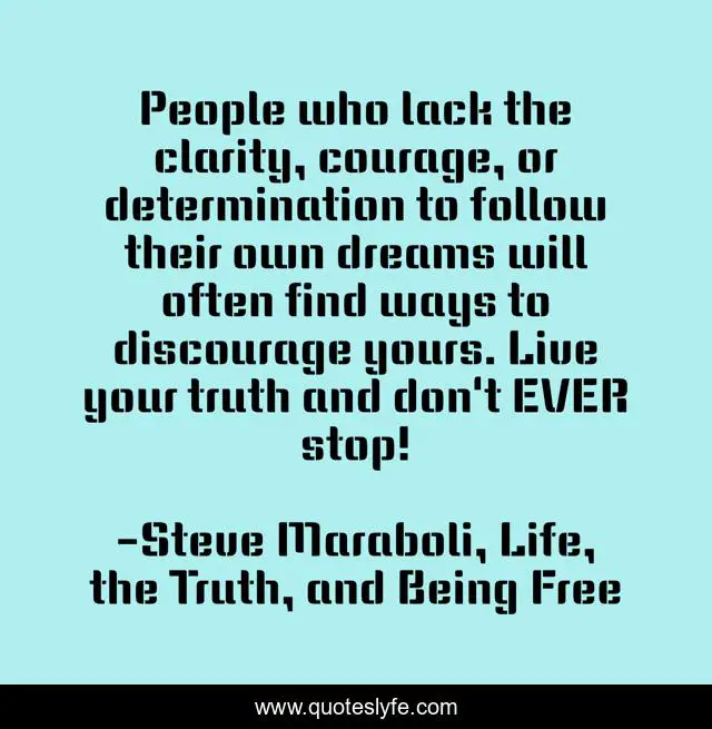 This page presents the quote "People who lack the clarity, courage, or determination to follow their own dreams will often find ways to discourage yours. Live your truth and don't EVER stop!". Author of this quote is Steve Maraboli, Life, the Truth, and Being Free. This quote is about living, confidence, inspirational, determination, positive, motivational, courage, follow-your-dreams, optimistic,.
