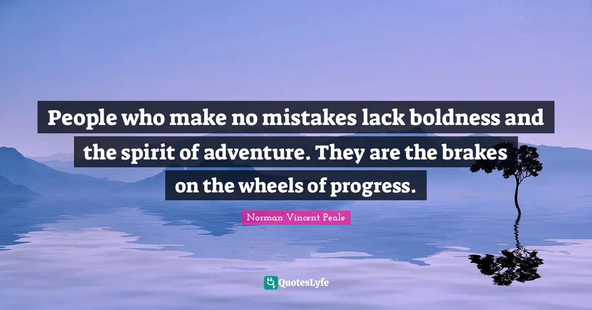 This page presents the quote "People who make no mistakes lack boldness and the spirit of adventure. They are the brakes on the wheels of progress.". Author of this quote is Norman Vincent Peale. This quote is about progress, mistakes, boldness, adventure, bold,.