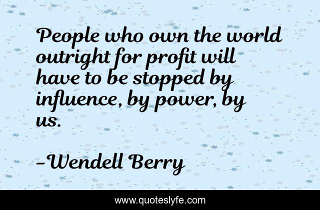 This page presents the quote "People who own the world outright for profit will have to be stopped by influence, by power, by us.". Author of this quote is Wendell Berry. This quote is about big-business, multinationals, abuse-of-power, corruption, power,.