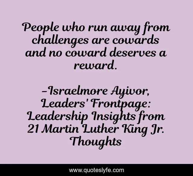 This page presents the quote "People who run away from challenges are cowards and no coward deserves a reward.". Author of this quote is Israelmore Ayivor, Leaders' Frontpage: Leadership Insights from 21 Martin Luther King Jr. Thoughts. This quote is about cowardice, brave, leaders, win, martin-luther-king, result, boldness, run-away-challenge, food-for-thought,.