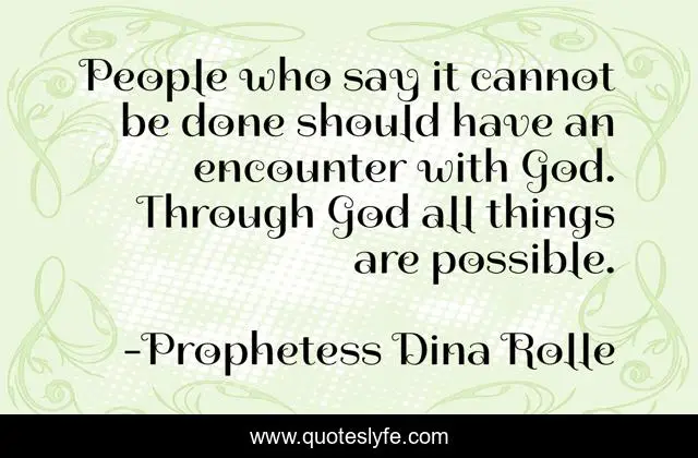 This page presents the quote "People who say it cannot be done should have an encounter with God. Through God all things are possible.". Author of this quote is Prophetess Dina Rolle. This quote is about god, all-things-are-possible, encounter, people,.