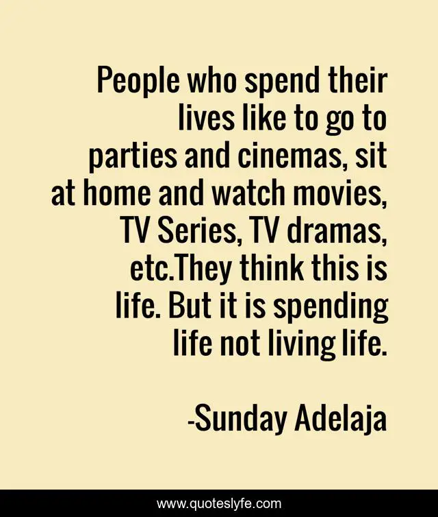 This page presents the quote "People who spend their lives like to go to parties and cinemas, sit at home and watch movies, TV Series, TV dramas, etc.They think this is life. But it is spending life not living life.". Author of this quote is Sunday Adelaja. This quote is about living, life, spend,.