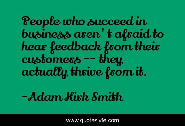 This page presents the quote "People who succeed in business aren't afraid to hear feedback from their customers -- they actually thrive from it.". Author of this quote is Adam Kirk Smith. This quote is about customers, business-advice, feedback, business, people, work, success, succeed, businesses,.