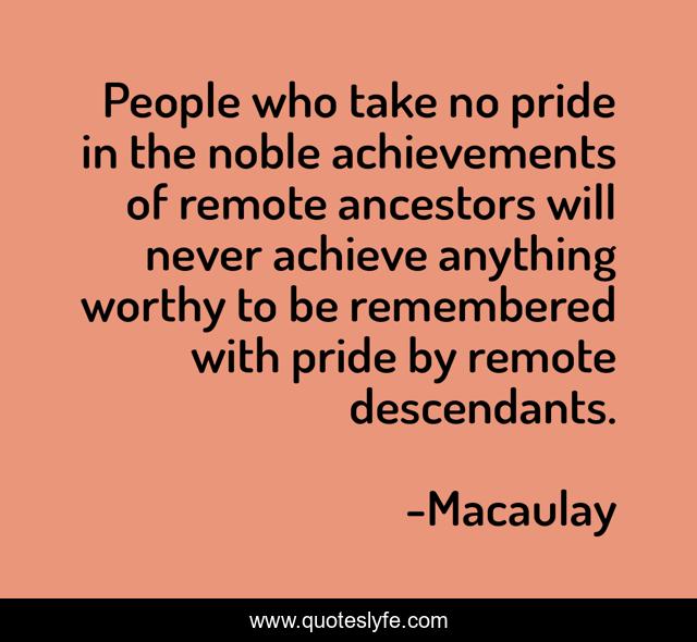 This page presents the quote "People who take no pride in the noble achievements of remote ancestors will never achieve anything worthy to be remembered with pride by remote descendants.". Author of this quote is Macaulay. .