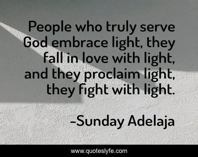 This page presents the quote "People who truly serve God embrace light, they fall in love with light, and they proclaim light, they fight with light.". Author of this quote is Sunday Adelaja. This quote is about love, light, serve, fight, proclaim, affection,.