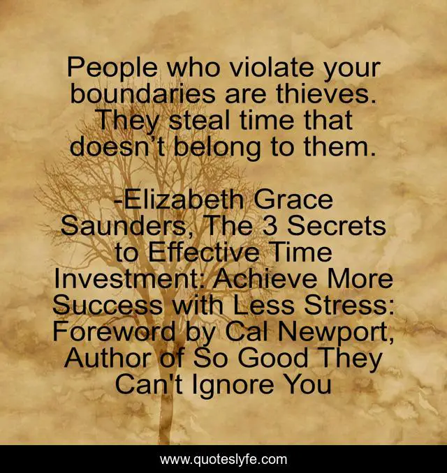"Elizabeth Grace Saunders, The 3 Secrets to Effective Time Investment: Achieve More Success with Less Stress: Foreword by Cal Newport, Author of So Good They Can't Ignore You Quotes." Quoteslyfe.com, 2025. Mon. 08 Dec. 2025. <https://www.quoteslyfe.com/quote/People-who-violate-your-boundaries-are-thieves-205123>.