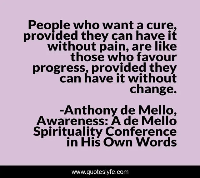 This page presents the quote "People who want a cure, provided they can have it without pain, are like those who favour progress, provided they can have it without change.". Author of this quote is Anthony de Mello, Awareness: A de Mello Spirituality Conference in His Own Words. This quote is about progress, awakening, spirituality,.
