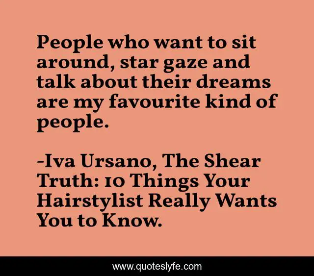 This page presents the quote "People who want to sit around, star gaze and talk about their dreams are my favourite kind of people.". Author of this quote is Iva Ursano, The Shear Truth: 10 Things Your Hairstylist Really Wants You to Know.. This quote is about confidence, inspirational, positive, motivational, optimistic, life-lessons, enthusiasm, dreams-inspirational,.
