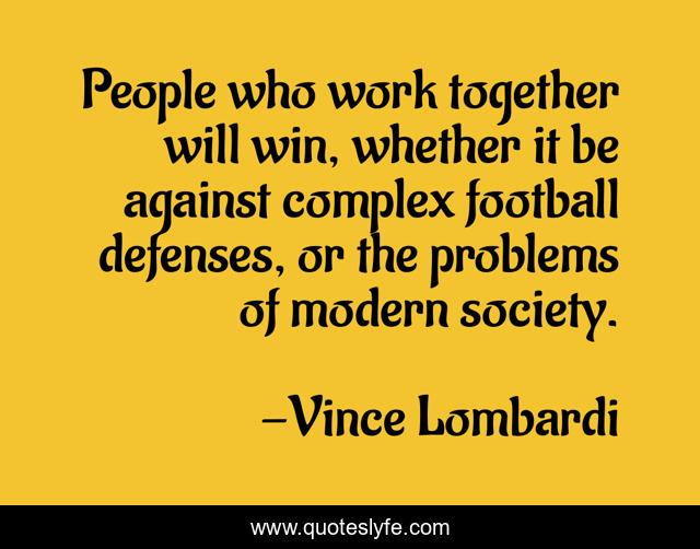 This page presents the quote "People who work together will win, whether it be against complex football defenses, or the problems of modern society.". Author of this quote is Vince Lombardi. This quote is about society, football, together,.